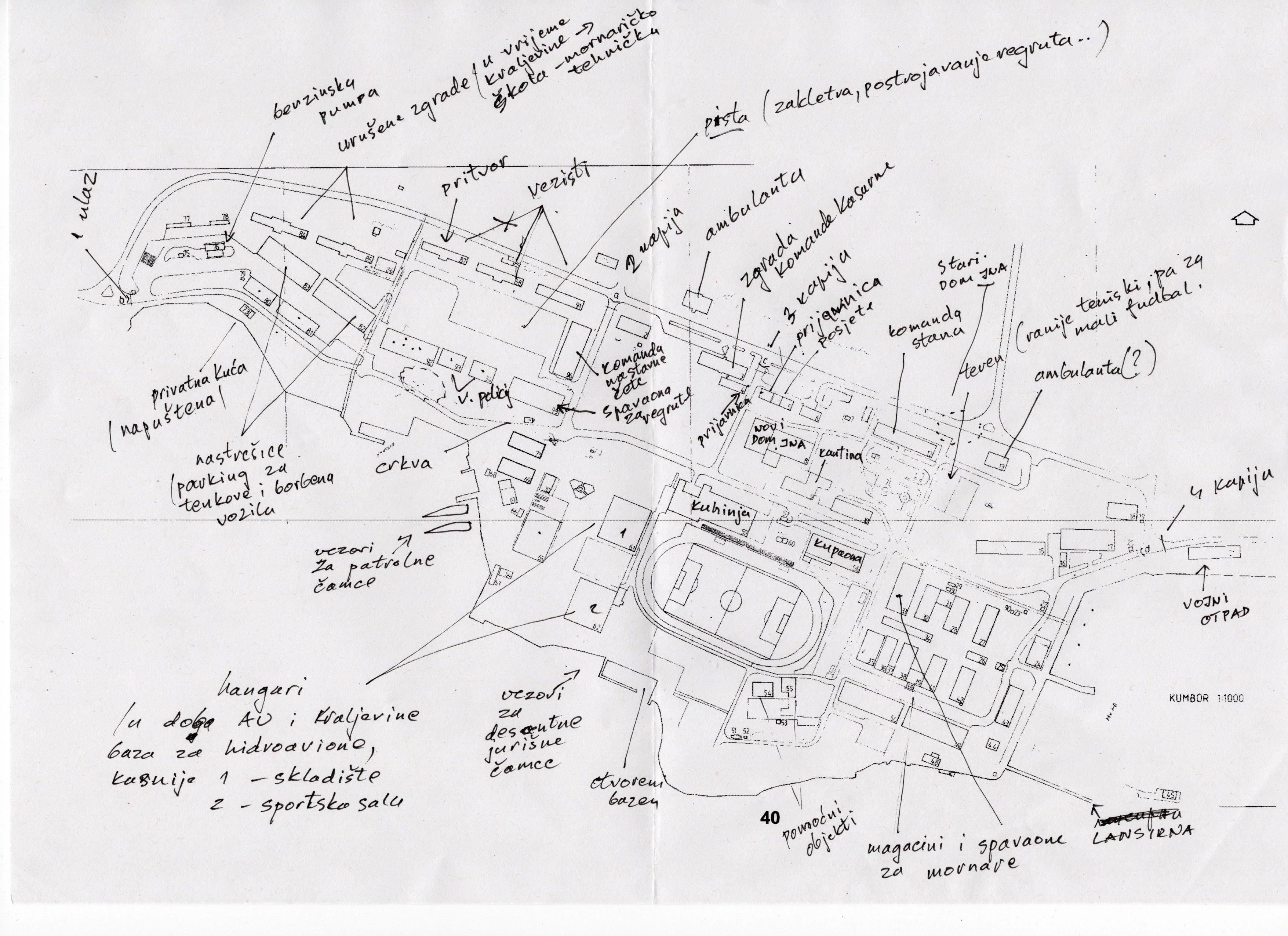 The pictures show drawings of memories of the military zone by Dako and Petar Mustur, father and son, whose home in Kumbor is in the immediate vicinity of the former barracks area. Petar served his military service in the Kumbor barracks. Dako, now retired, was a long-time employee of the military shipyard and overhaul institute Sava Kovačević in Tivat.