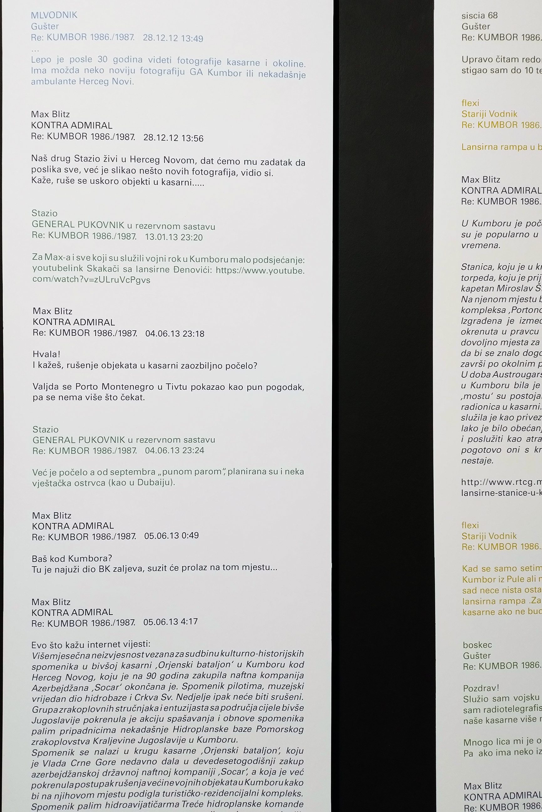 2/3 (exhibition space): Selection of comments from the internet forum "Forum of former members of the Yugoslav People's Army 22.12.1941.-18.07.1991." on the topic of the reconstruction of the former barracks "Orjenski Bataljon" in Kumbor, Montenegro.